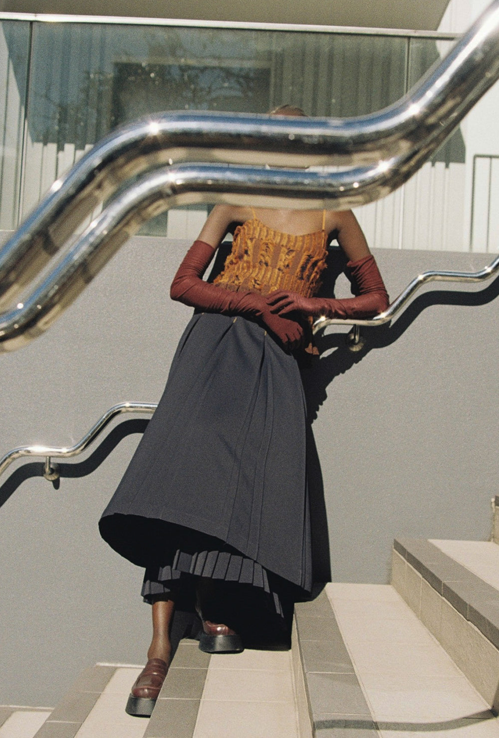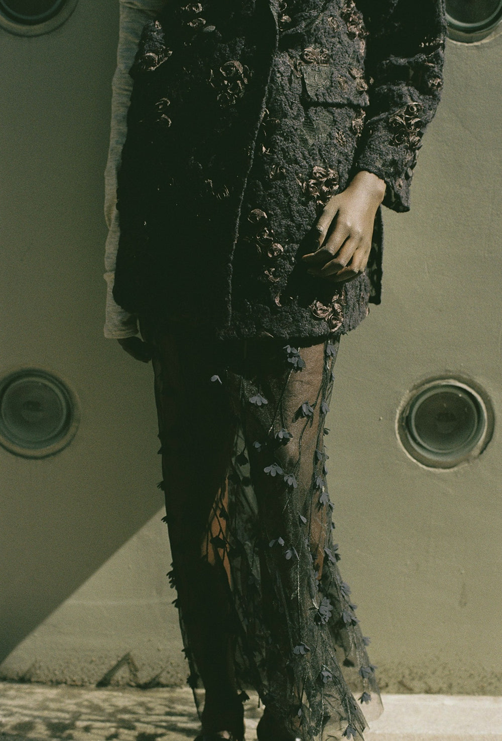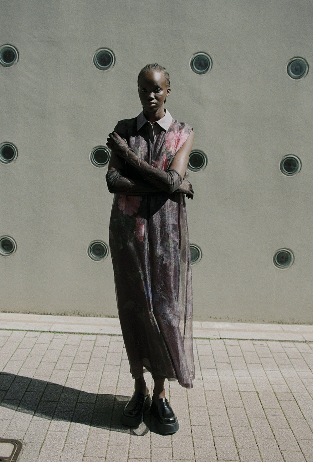 SHEER TOP ¥13,200/SKIRT ¥19,250/LOAFER ¥25,300