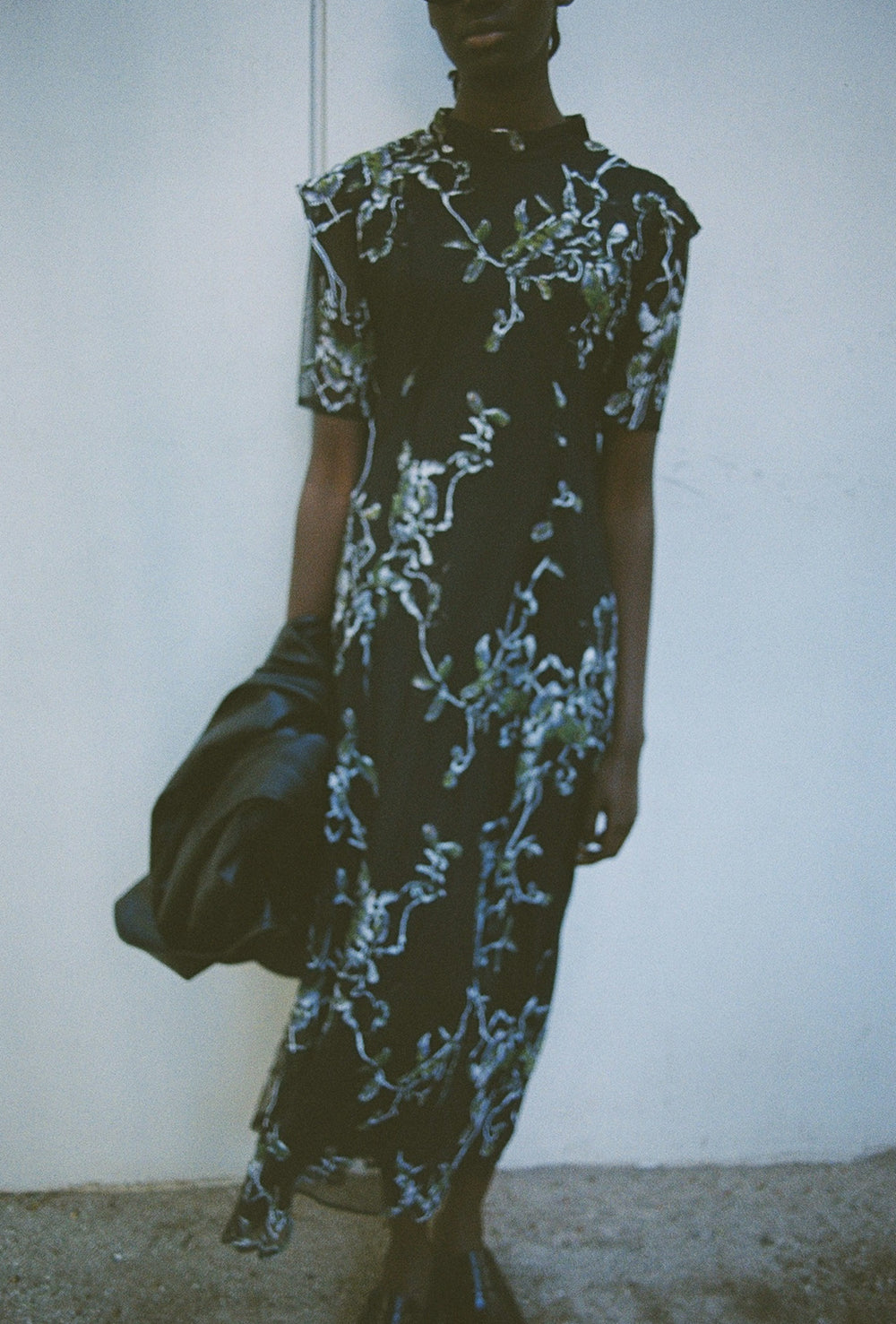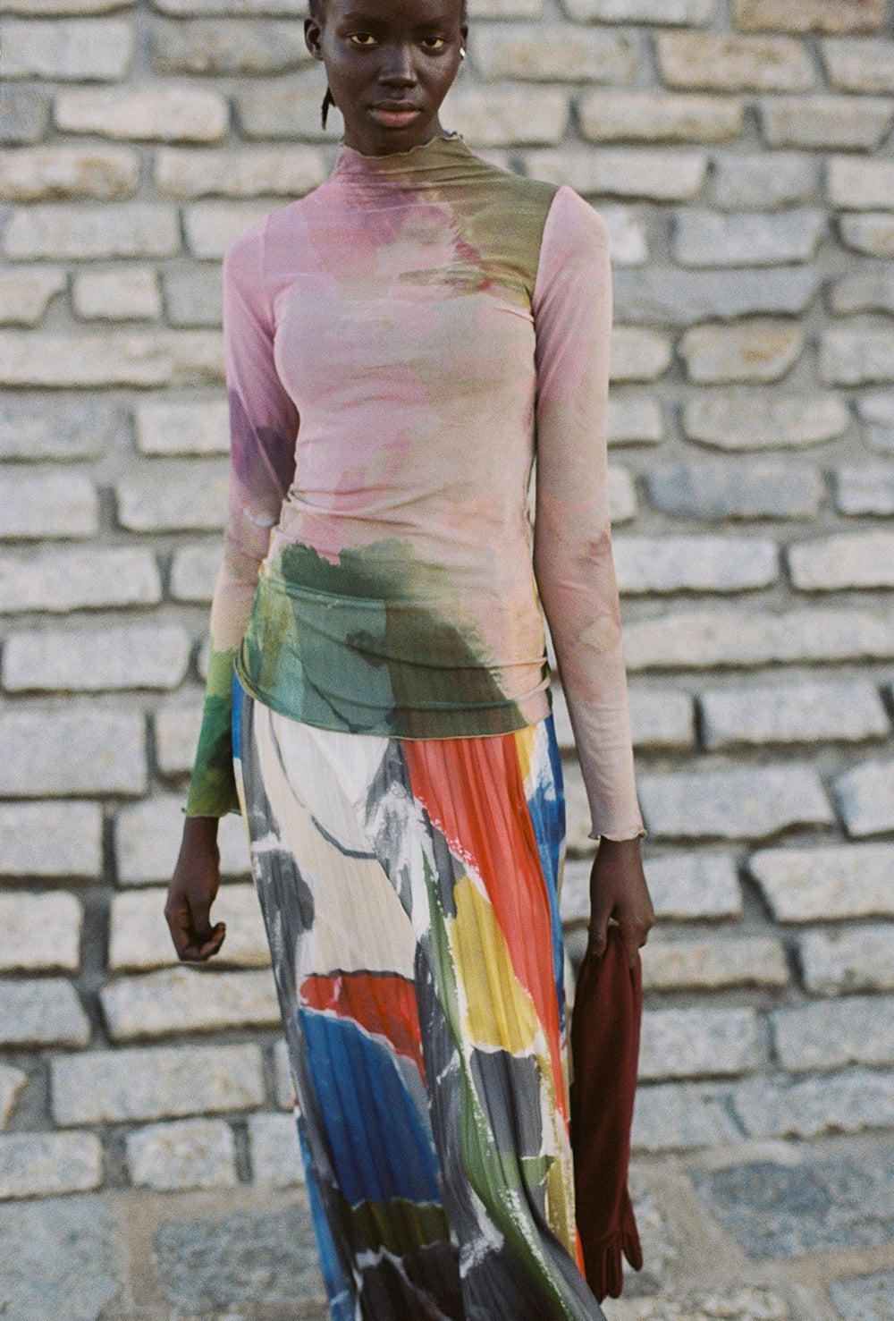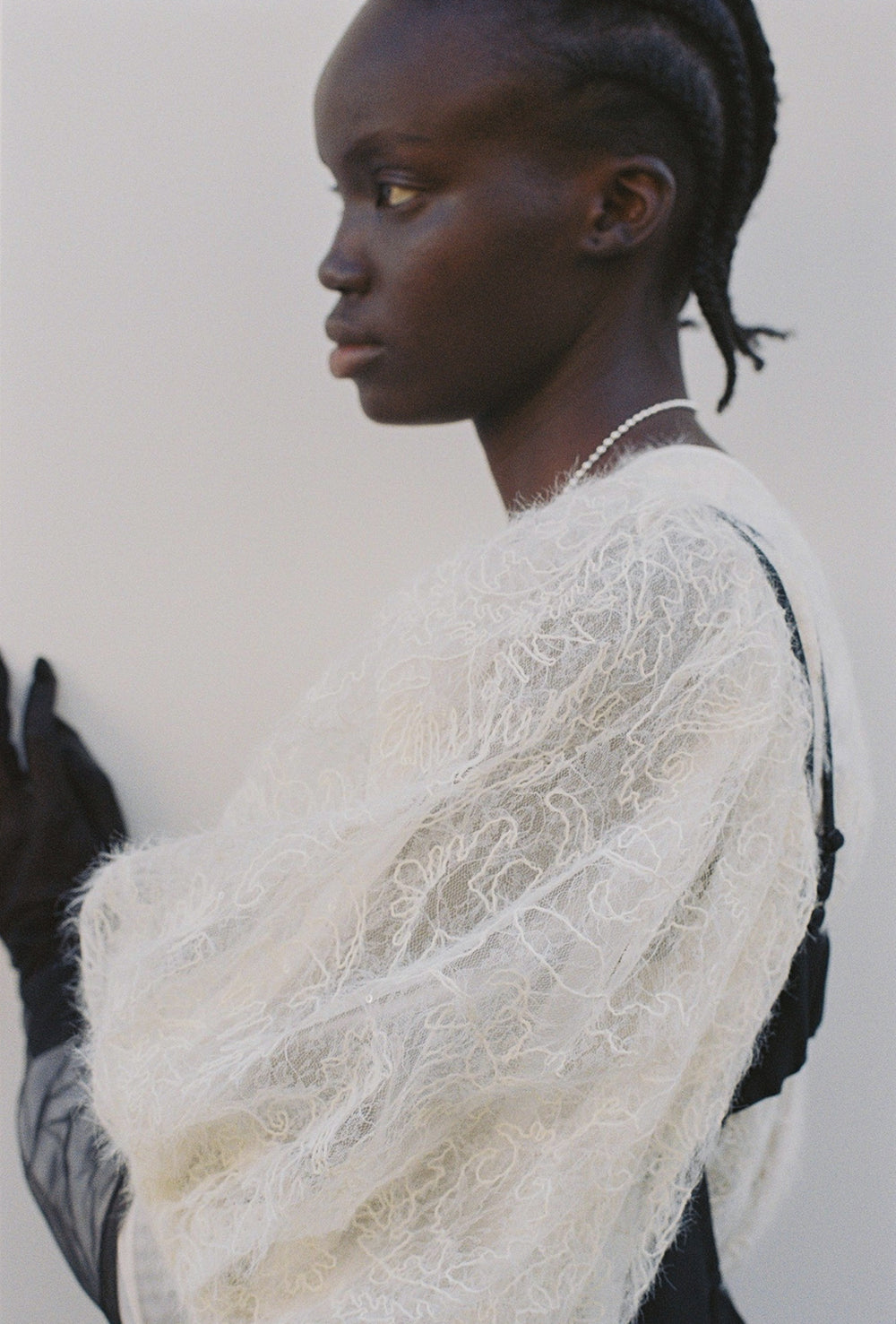SHEER TOP ¥13,200/SKIRT ¥19,250/LOAFER ¥25,300