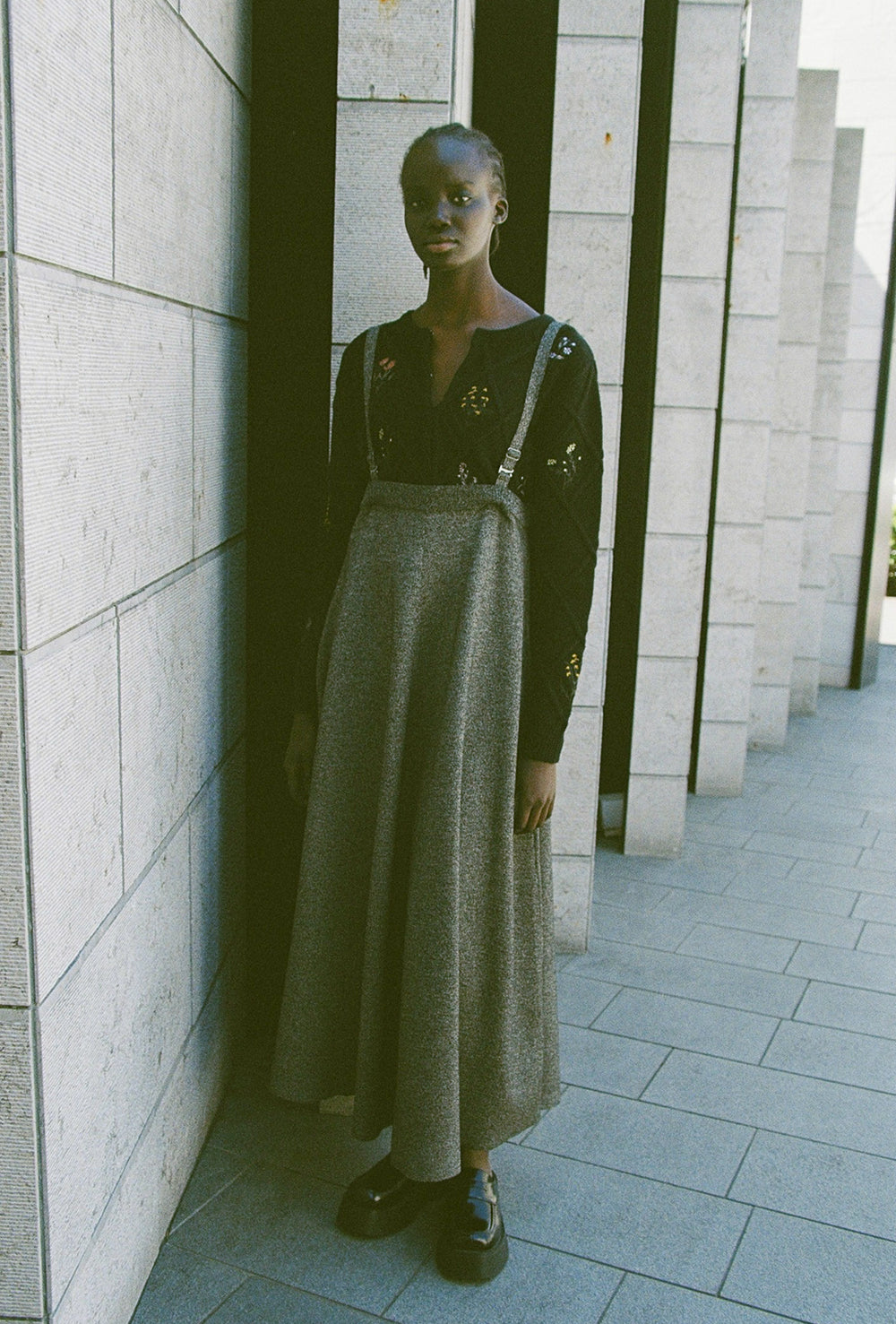 CARDIGAN ¥18,150/SUSPENDER DRESS ¥25,300(Sep.)/LOAFER ¥25,300