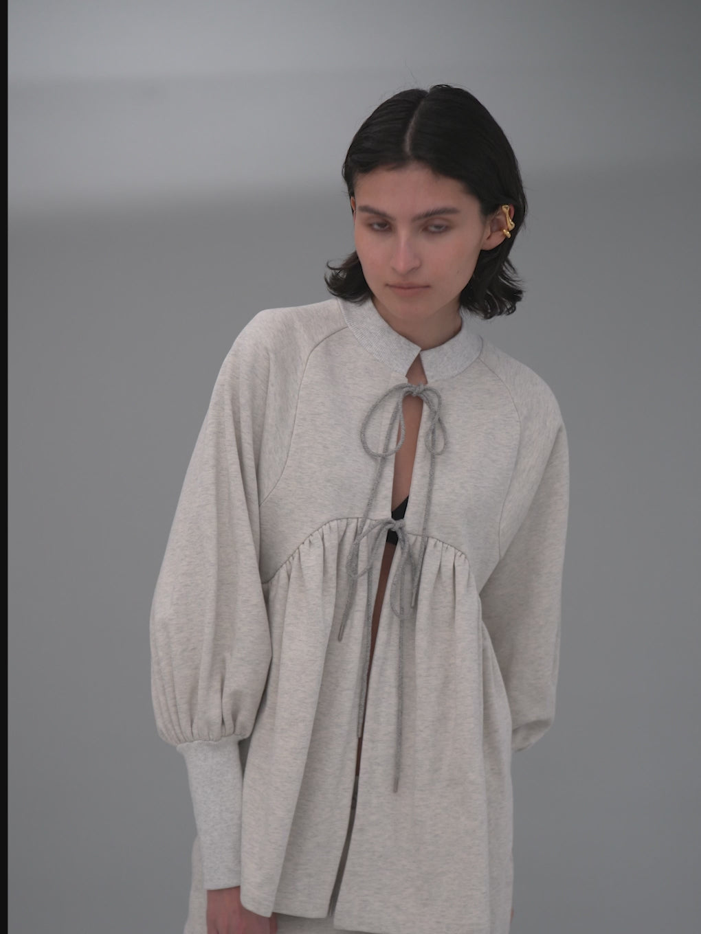 カジュアルなアイテムを女性らしい布帛ライクなデザインに落とし込んだ一着。