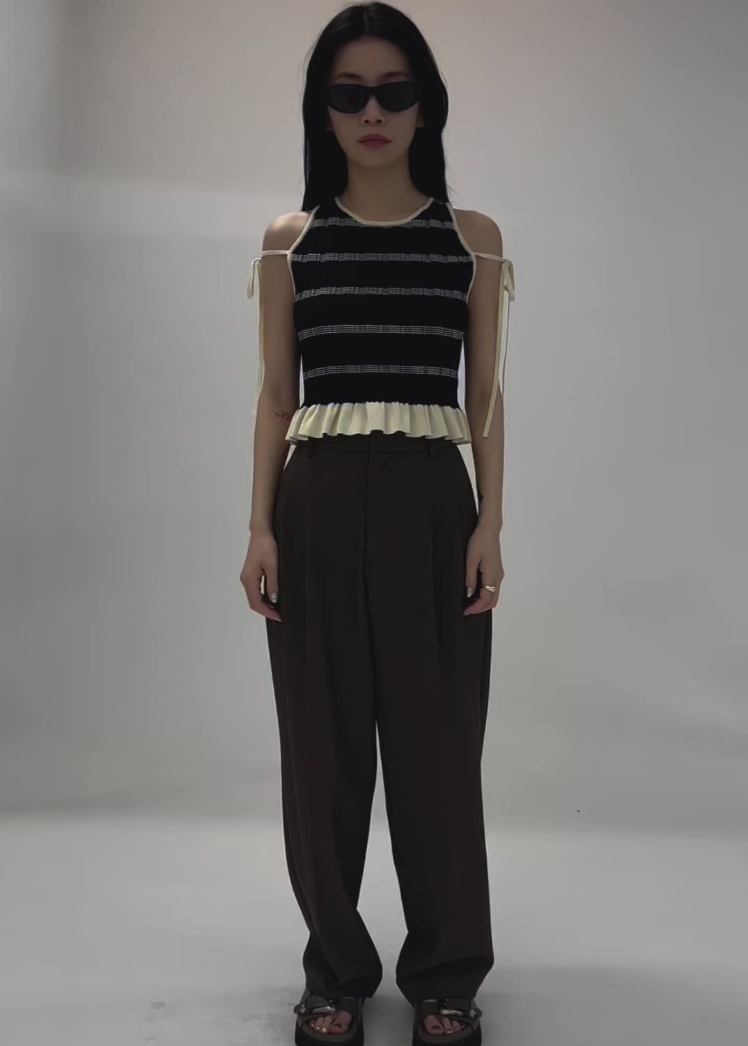 リブ編みを利用した裾のフリフリを活かすため、短丈で作成しました。