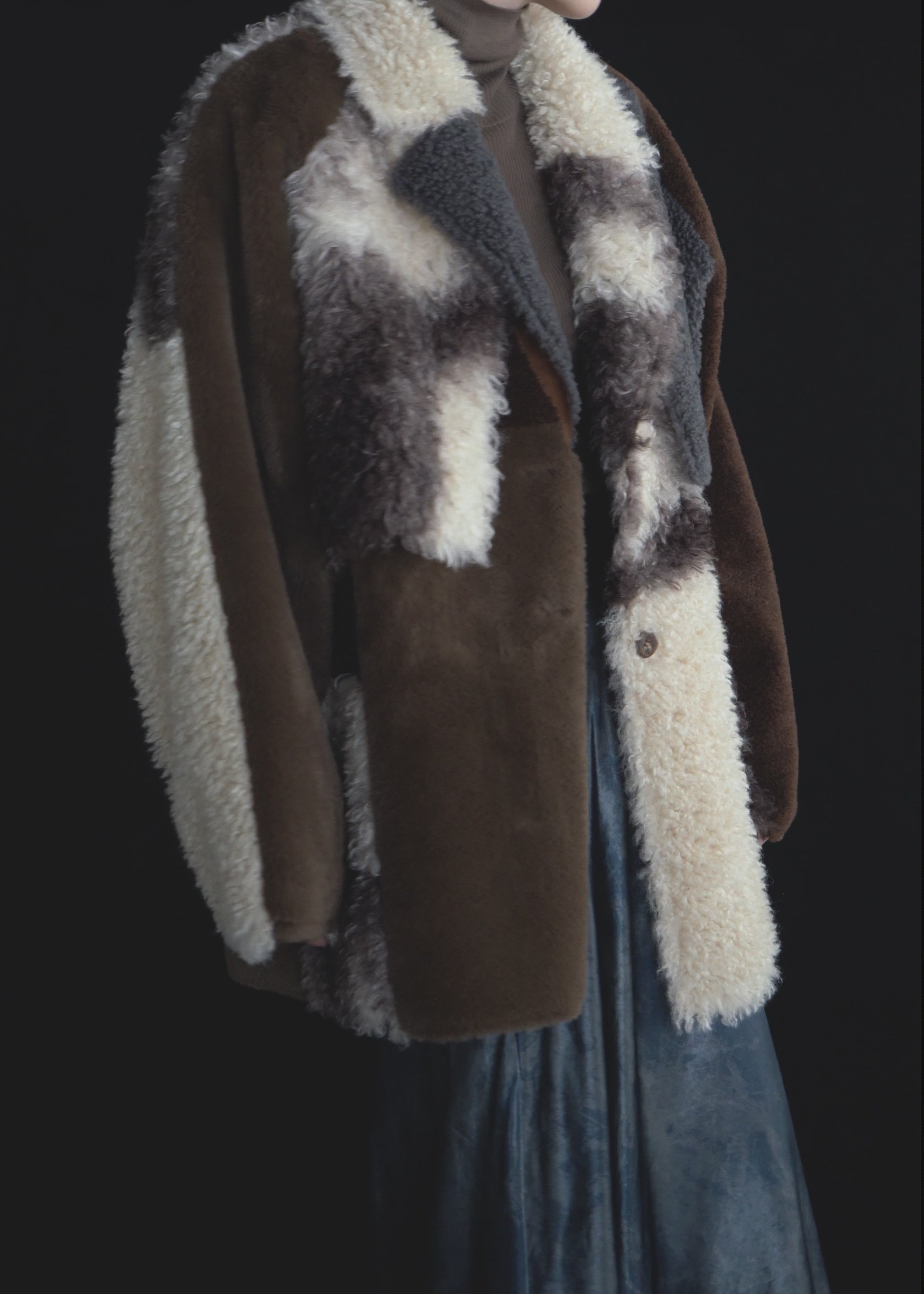 五種類のボアやファーをパッチワークしたキャッチーなアイテム。