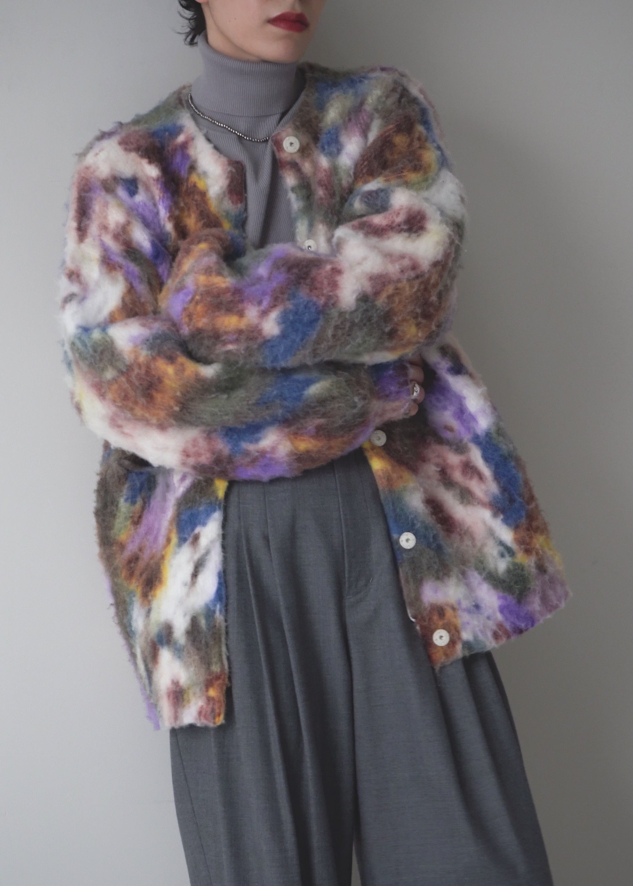 テクスチャーアートで仕上げたニュアンス花柄のシャギーカーディガン。